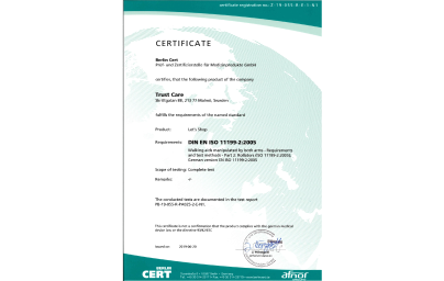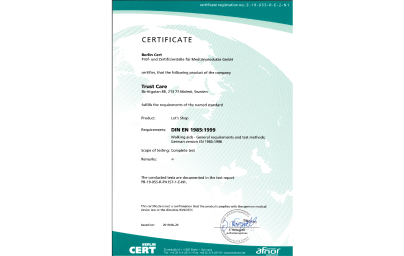 ISO EN 11199-2:2005認証書は、国際的な安全基準をクリアした製品であることを示しています。シニアや障がい者を持つ方のためにデザインされたこの歩行補助具は、安全性と品質の高さが認められており、安心してお使いいただけます。